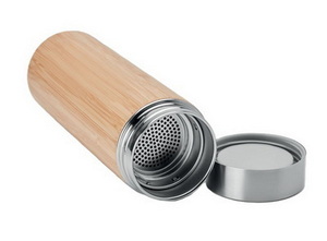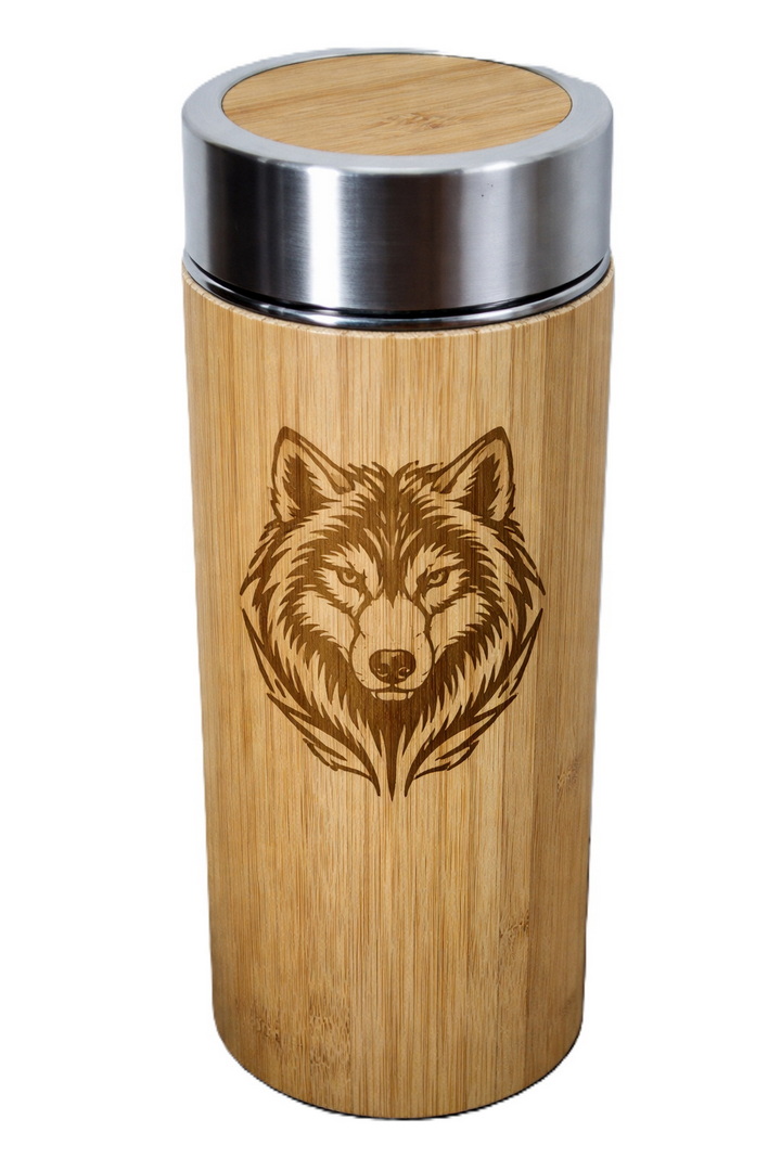 Farkas mintás duplafalú rozsdamentes acél termosz bambusz borítással, teaszűrővel.