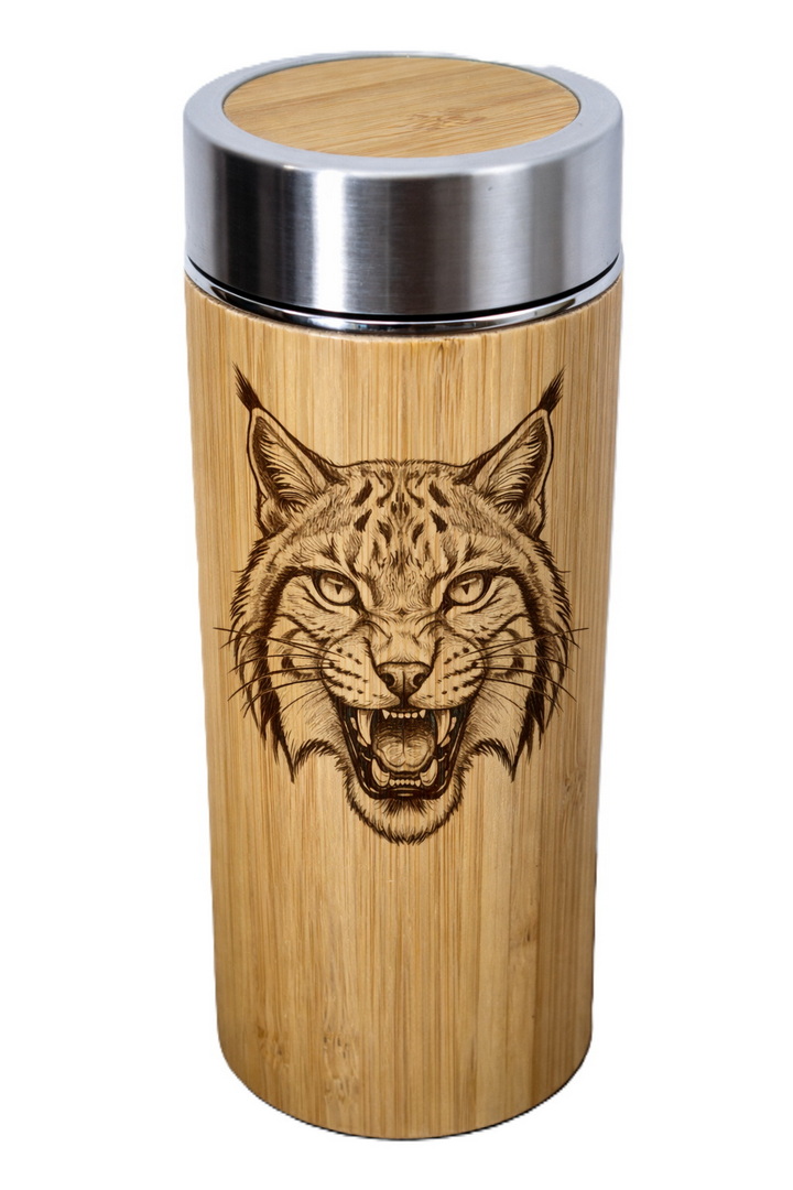 Hiúz mintás duplafalú rozsdamentes acél termosz bambusz borítással, teaszűrővel.