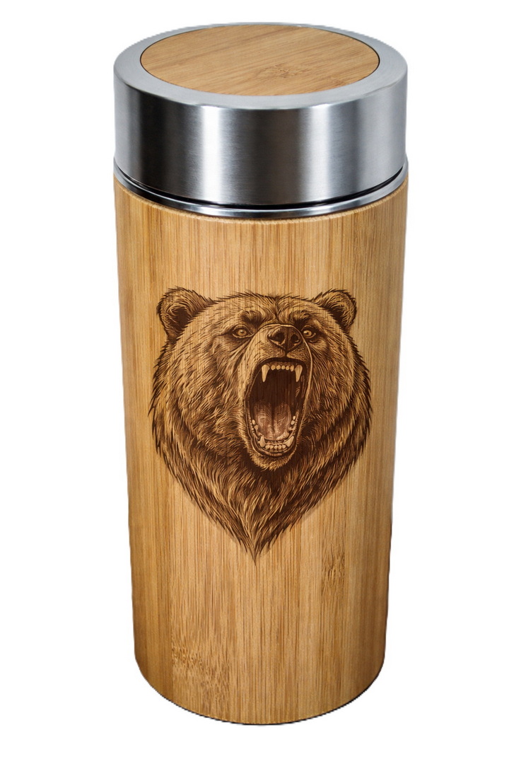 Üvöltő medve mintás duplafalú rozsdamentes acél termosz bambusz borítással, teaszűrővel.